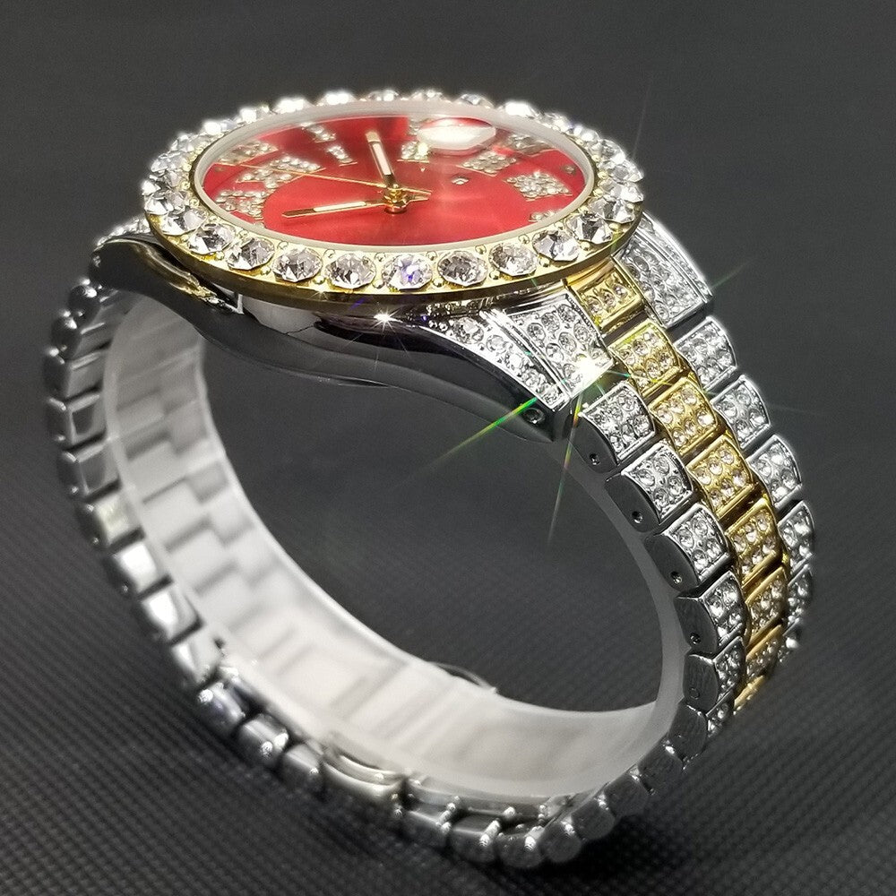 Red Royal Dial Diamond and Gold Watch – Fully Iced Out Luxury Edition